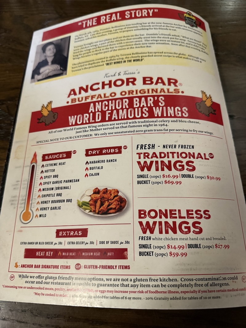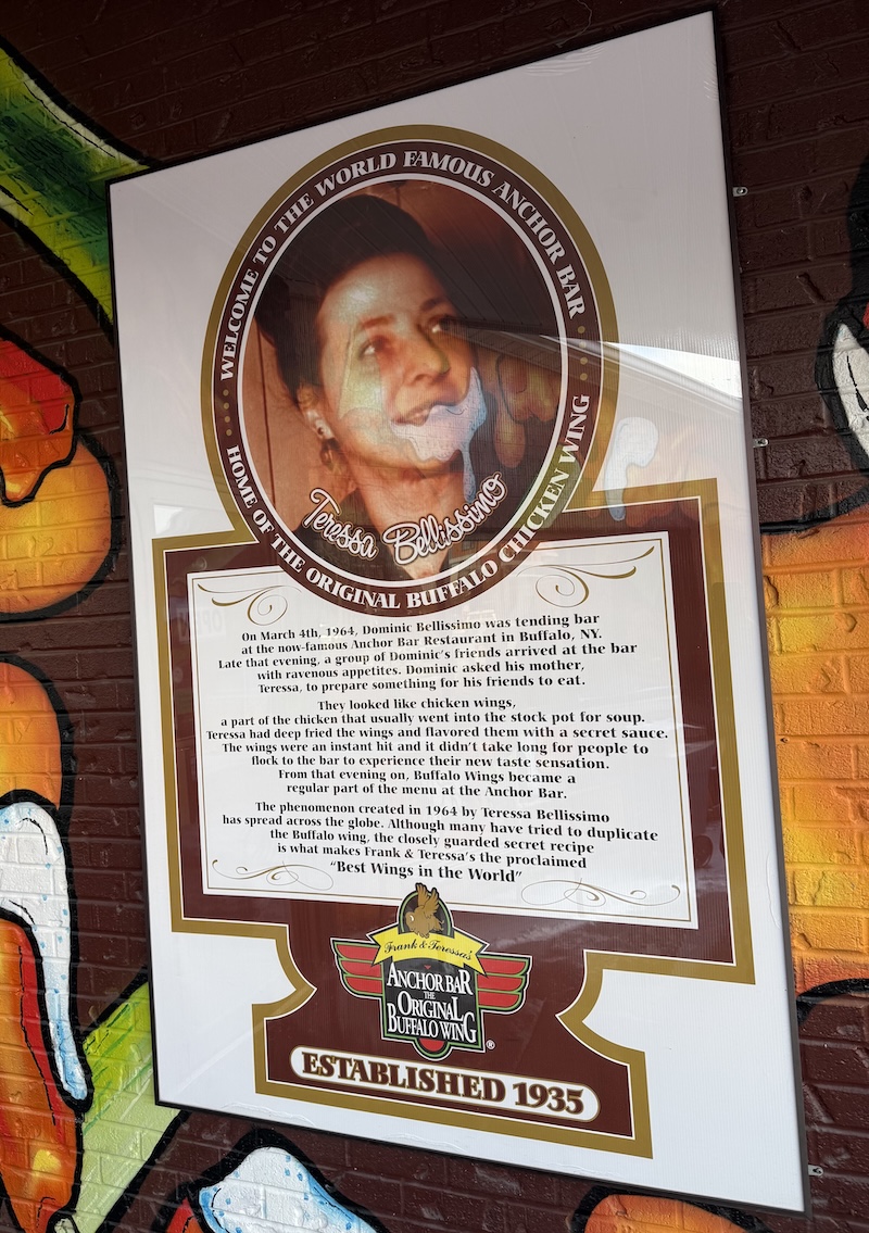 Like a beacon of light, the sun illuminated a path to lead us to the reported birthplace of the Buffalo Wing. Local legend has it that Teressa Bellissimo was at the Anchor Bar in 1964 when her son Dominic made a desperate late night plea to feed him and his friends. With limited options to consider she improvised and chose to deep fry some chicken wings, typically meant for the stock pot for soup, and flavored them with a “secret sauce.” This improvisation was an instant hit and quickly advanced from local legend to global phenomenon.