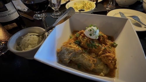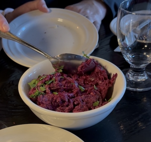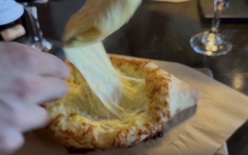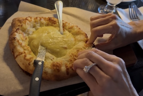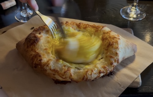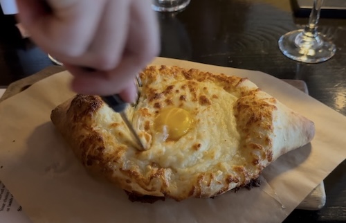 For starters, you have got to try the Khachapuri! You’ll likely be at least a little mesmerized as this Georgian egg and cheesy masterpiece is artistically woven together at the table in front of you. It is ideal for sharing.