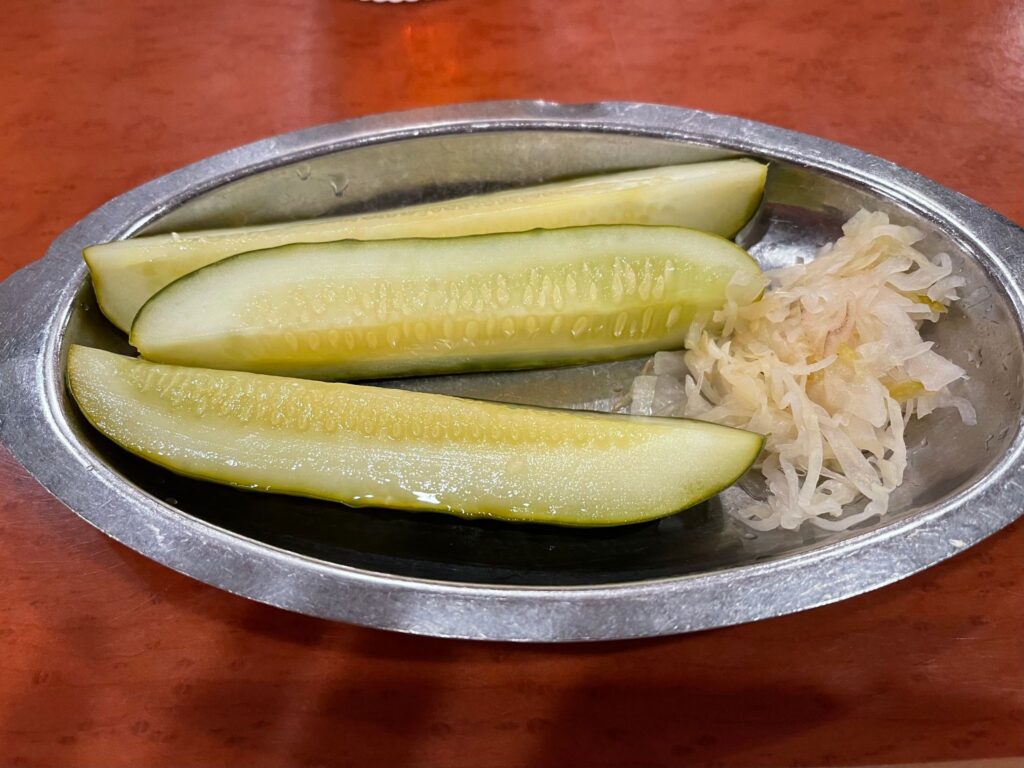When you’re seated you’ll receive a small dish of pickles and sauerkraut. They are both outstanding, so be careful not to dismiss them without at least a sampling. None of either survived at our table.