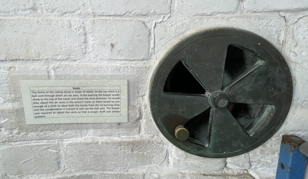 Second, you also get an up close introduction to the air vents in the lantern room that the lighthouse keeper manipulates to facilitate the efficient exit of both the fumes from the oil burning lamp (that provides the beam that the Fresnel lens magnifies) and the condensation it creates.
